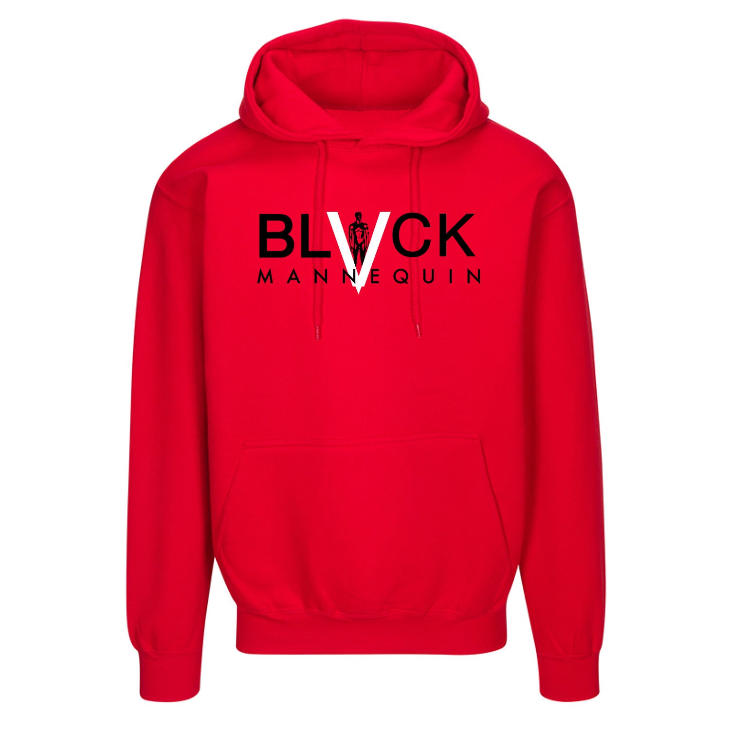 Red hoodie with classic Black Mannequin logo on the front chest.Â