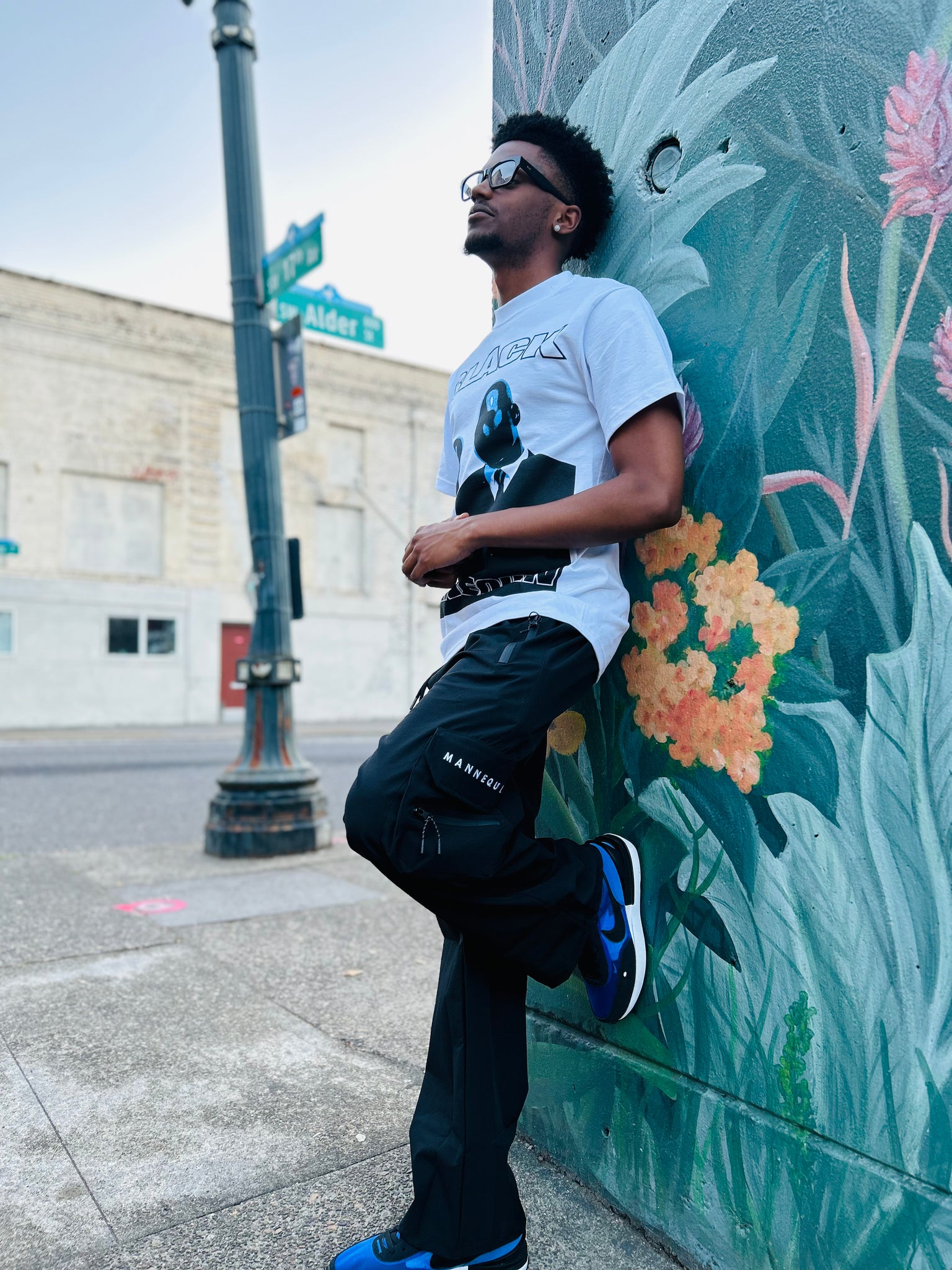 Black nylon wide leg pants. Right leg has 1 zipper pocket and 1 flap pocket. Left leg has 2 zipper pockets and 1 flap pocket with MANNEQUIN embroidered.
