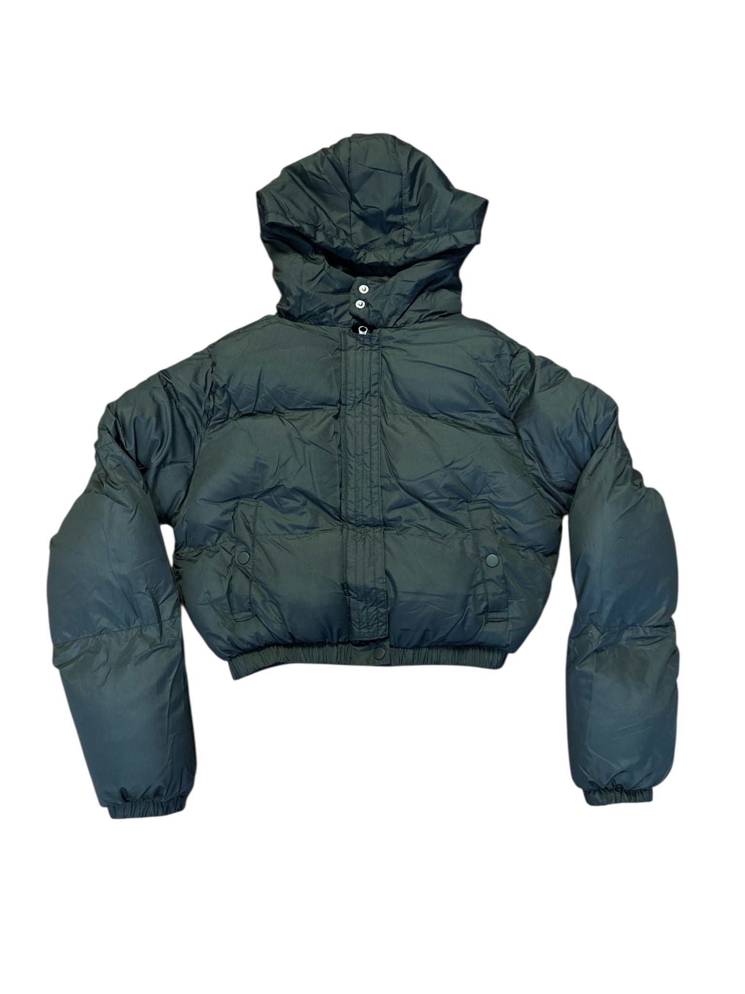 New puff long sleeve hoodie coat, Front zipper, Side snap pockets, snap button collar, Warm and comfy